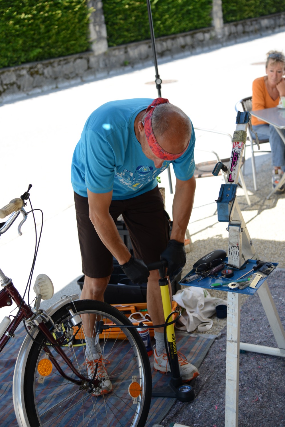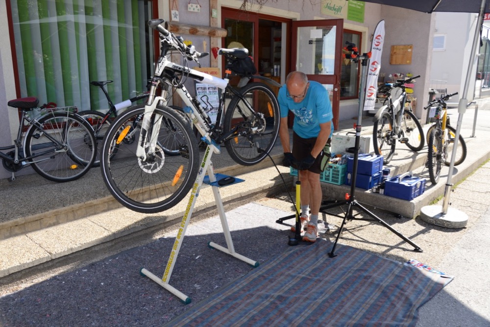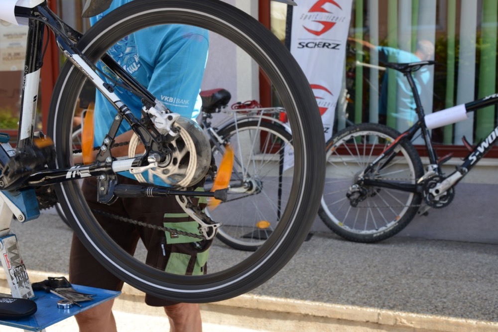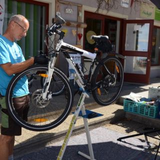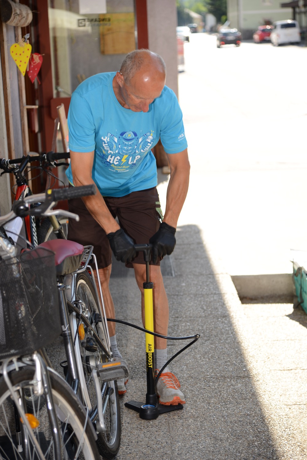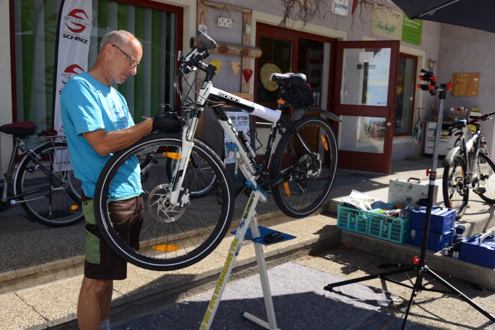 Für das professionelle Service sorgte Franz Schachner – ein Rad-Profi sozusagen – von Sport Scherz in Wörschach, der von der defekten Lichtanlage bis zur Einstellung der Gangschaltung die Arbeit mit Fachkenntnis, flott und kostengünstig erledigte. „Am wichtigsten ist“, so Schachner, „dass der Reifendruck passt. Das macht unheimlich viel aus, um mit dem Rad gut voranzukommen“. Und so pumpte Franz Schachner auch fleißig Luft in die Pneus.
