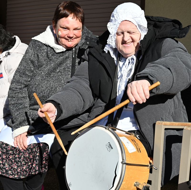 Die Trommelweiber zu Liezen am Faschingdienstag zu Besuch in der Salzstraße 24. Inmitten Ehrenmitglied Walter.