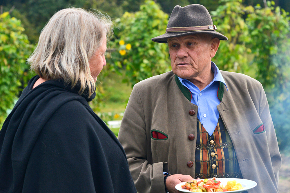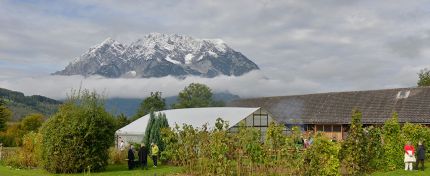 Es war eine schöne und ebenso erfolgreiche Saison, welche die Gartenbaumannschaft auf ihrem rund 1200 Quadratmeter großen Areal zubringen konnte. Die Kundinnen und Kunden der Lebenshilfe Ennstal waren mit großer Freude und Begeisterung am Werk, die Ernte war mehr als zufriedenstellend – und mit September dieses Jahres wurde auch noch das Bio-Zertifikat der Austria Bio Garantie-Landwirtschaft GmbH für den gesamten Anbau von Kräutern und Pflanzen verliehen. Grund genug, um am 8. Oktober 2019 zum Erntedank mit KundInnen, Eltern, Freunden und Vetreter der Höheren Bundeslehr- und Forschungsanstalt für Landwirtschaft Raumberg-Gumpenstein – repräsentiert durch Hofrat Mag. Dr. Anton Hausleitner, DI Dr. Karl Buchgraber und Dr. Johann Gasteiner – zu laden, um gemeinsam in gemütlich-legerer Art zu brunchen und an einem der schönsten Arbeitsplätze des Ennstales für die gute Ernte danke zu sagen.