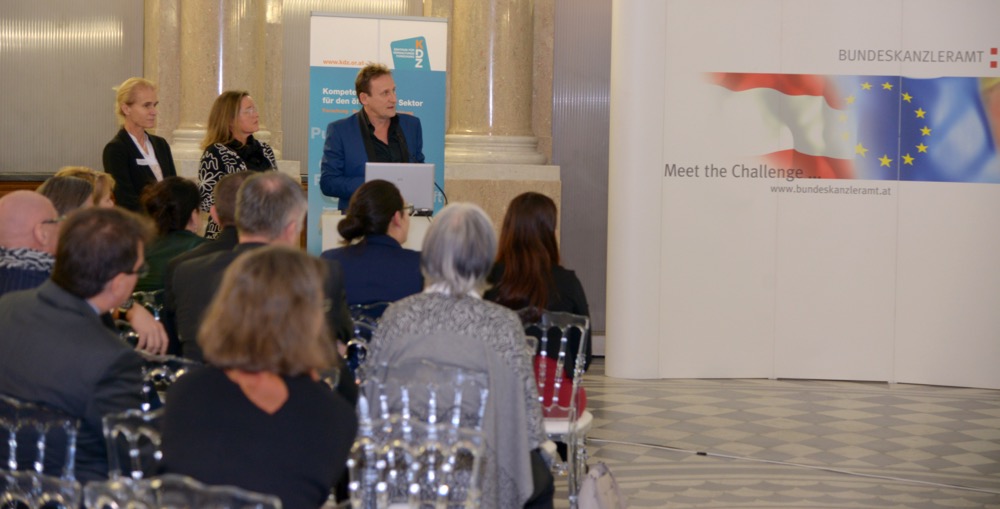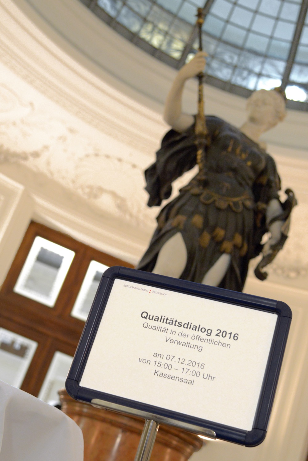 Beim Qualitätsdialog wurden Themen wie die Qualität der Verwaltung in der digitalen Gesellschaft und der Beitrag des CAF (Common Assessment Framework) in der nachhaltigen Qualitätsverbesserung sowie deren Beitrag zur sozialen und gesellschaftlichen Verantwortung diskutiert. Zu den Vortragenden zählten Staatssekretärin Mag. Muna Duzdar (Staatssekretärin für Diversität, Öffentlichen Dienst und Digitalisierung), Sektionschefin Mag. Angelika Flatz (Leiterin der Sektion III des Bundeskanzleramtes), Mag. Günther Horniak (Studiengansleiter Bachelorstudium Public Management, FH Campus Wien) sowie Robert Nagele (Vorstandsdirektor Billa AG Österreich).