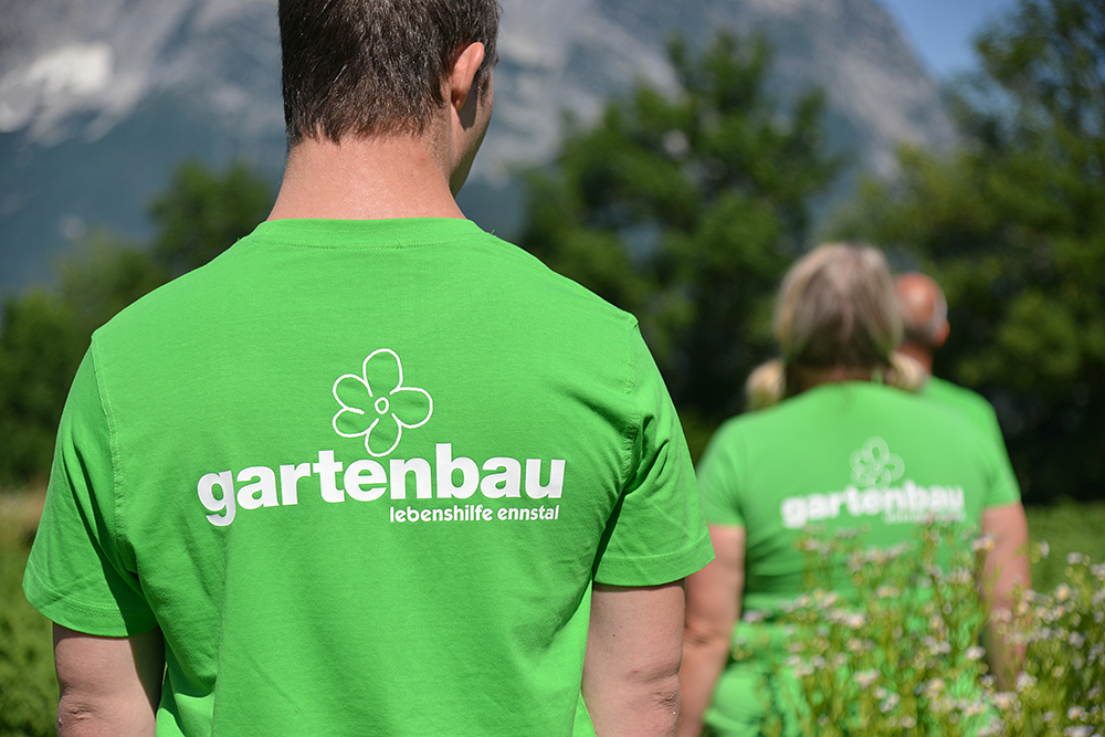 Voller Stolz präsentiert sich das Gartenbauteam mit den neuen Arbeitsdressen vor der traumhaft schönen Kulisse des Grimming.
