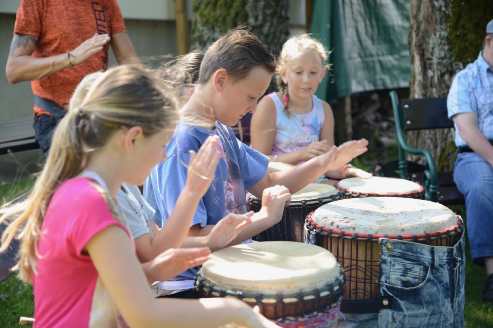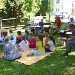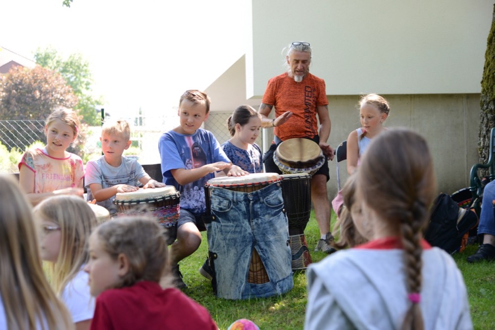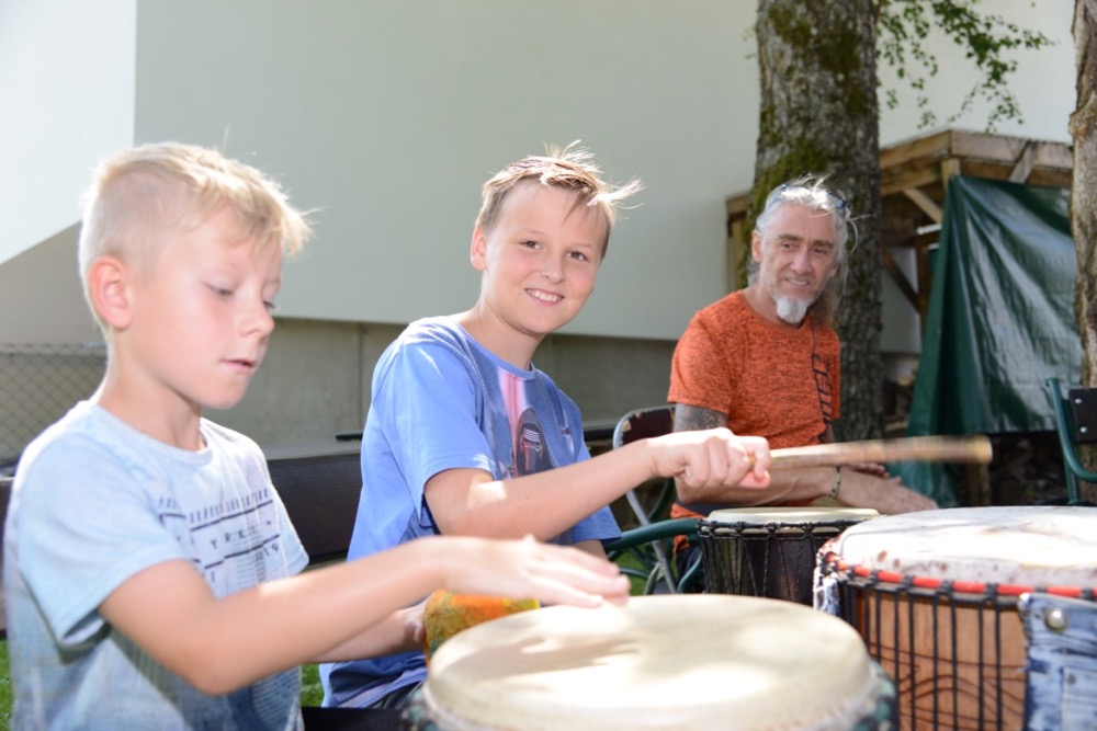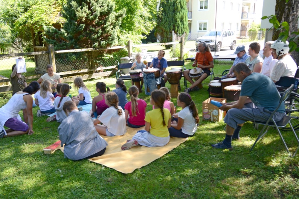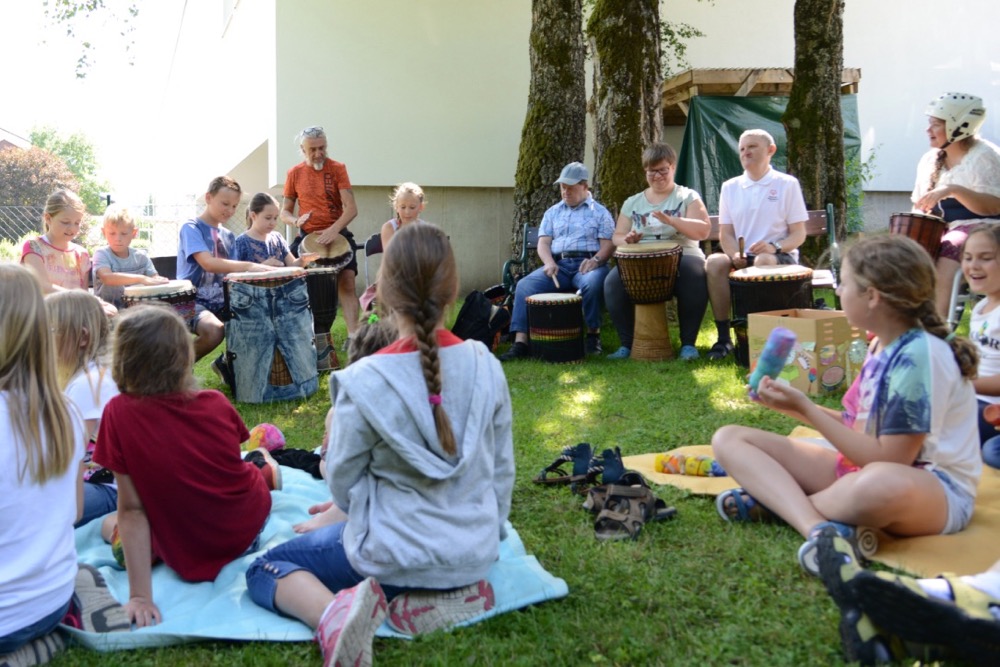 Während auf der zur Hauptstraße liegenden Seite der Werkstätte an diesem Tag die Reparier·Bar voll im Gang war (siehe Bericht), wurde im kleinen Garten hinter dem Haus fleißig musiziert. Denn Schülerinnen und Schüler der Volksschule Gaishorn waren zu Besuch gekommen, um einen gemeinsamen Vormittag in der Lebenshilfe Rottenmann zu verbringen und zu erleben, was hier so alles gemacht wird. Natürlich gab es nach der Hausführung ein gemütliches Beisammensitzen bei einer kleinen Jause. Anschließend wurde draußen gemeinsam gesungen und getrommelt. Fachbegleiter Herbert Wieser, im zivilen Leben begeisterter "Freedrummer", hatte eine ganze Menge Trommeln mitgebracht, die von den Kids fleißig und begeistert "bedient" wurden.