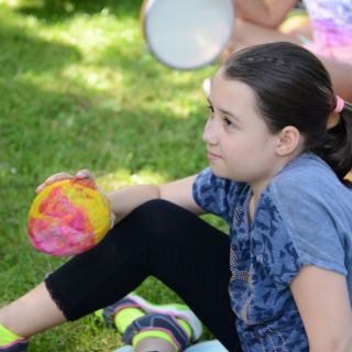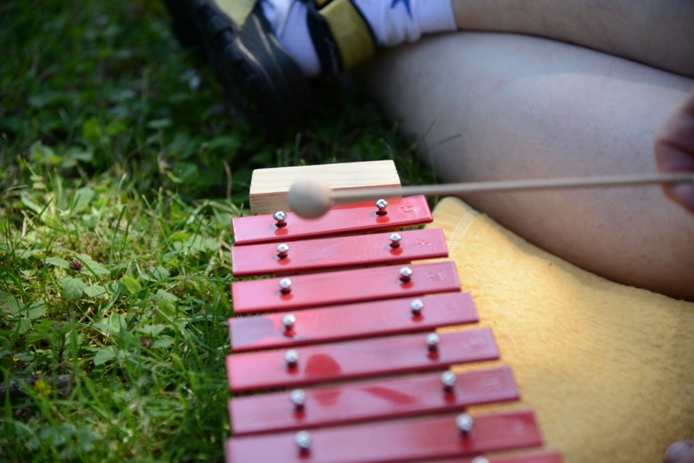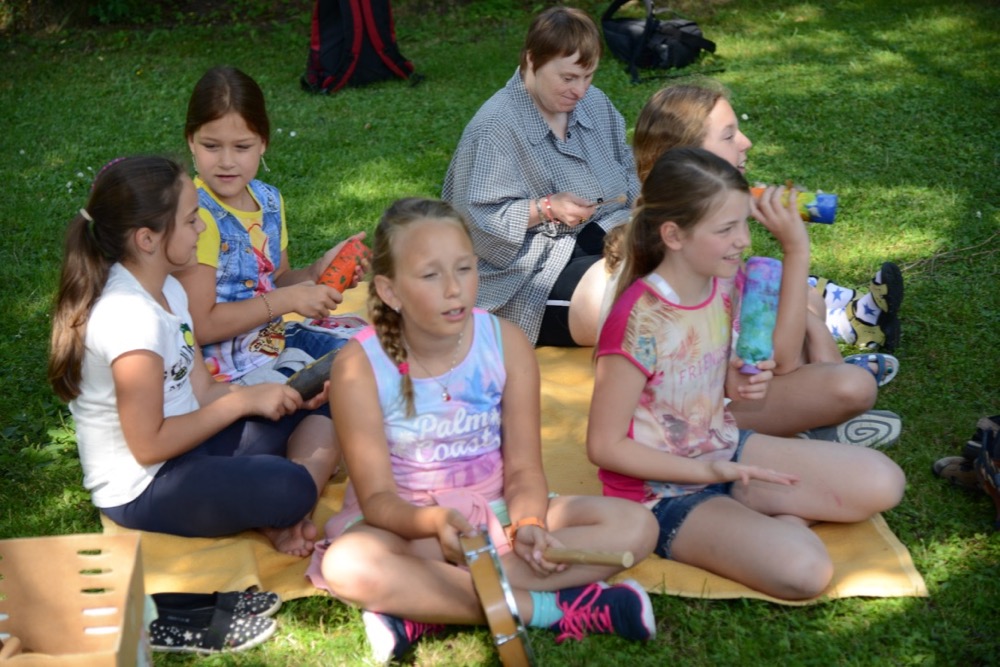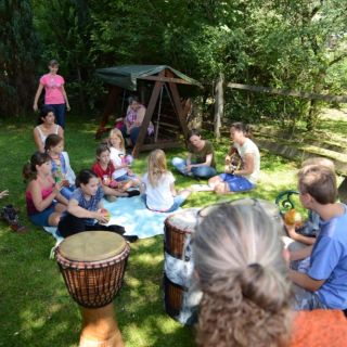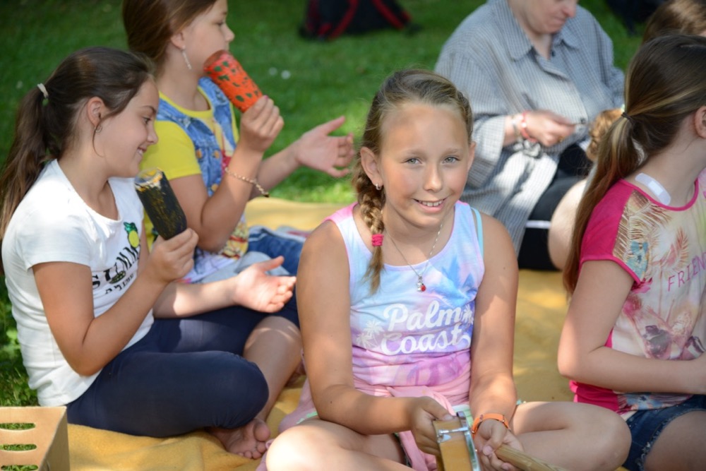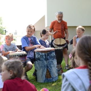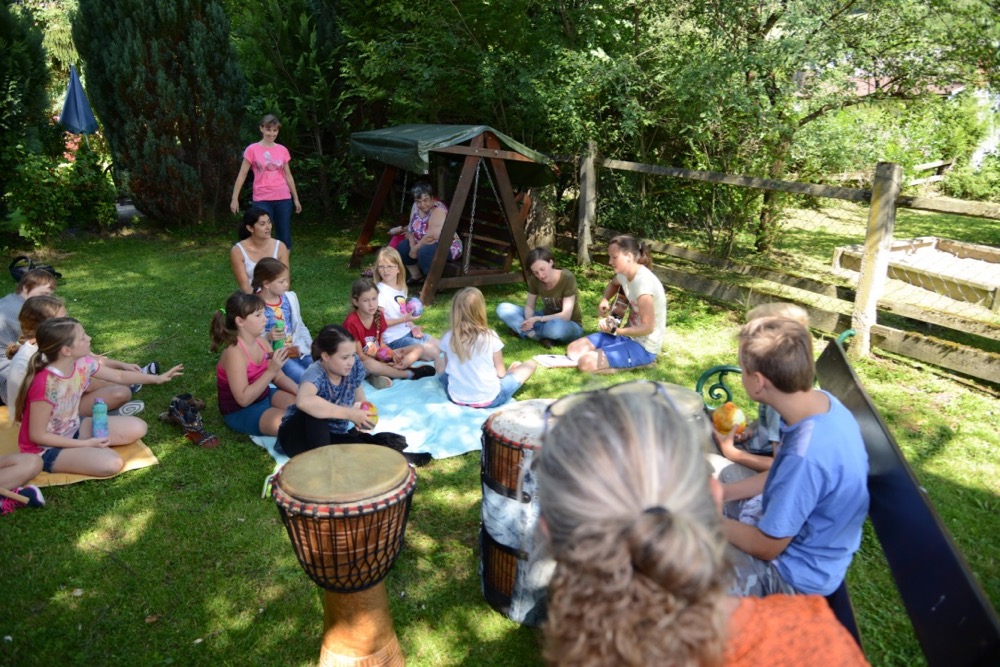 Während auf der zur Hauptstraße liegenden Seite der Werkstätte an diesem Tag die Reparier·Bar voll im Gang war (siehe Bericht), wurde im kleinen Garten hinter dem Haus fleißig musiziert. Denn Schülerinnen und Schüler der Volksschule Gaishorn waren zu Besuch gekommen, um einen gemeinsamen Vormittag in der Lebenshilfe Rottenmann zu verbringen und zu erleben, was hier so alles gemacht wird. Natürlich gab es nach der Hausführung ein gemütliches Beisammensitzen bei einer kleinen Jause. Anschließend wurde draußen gemeinsam gesungen und getrommelt. Fachbegleiter Herbert Wieser, im zivilen Leben begeisterter "Freedrummer", hatte eine ganze Menge Trommeln mitgebracht, die von den Kids fleißig und begeistert "bedient" wurden.