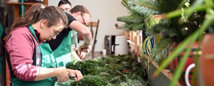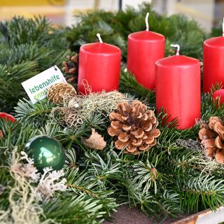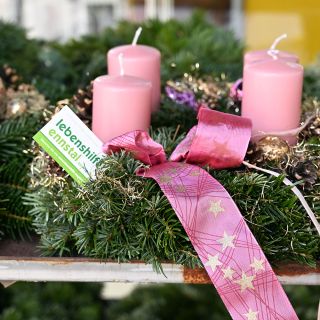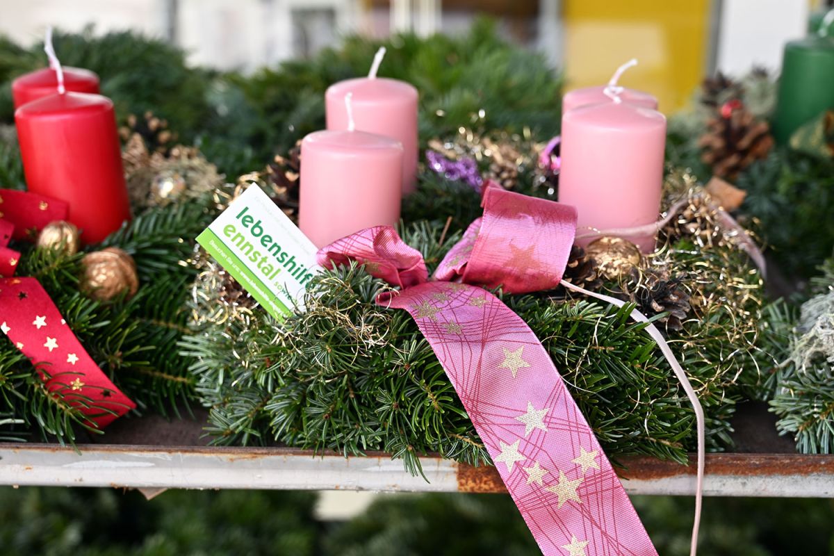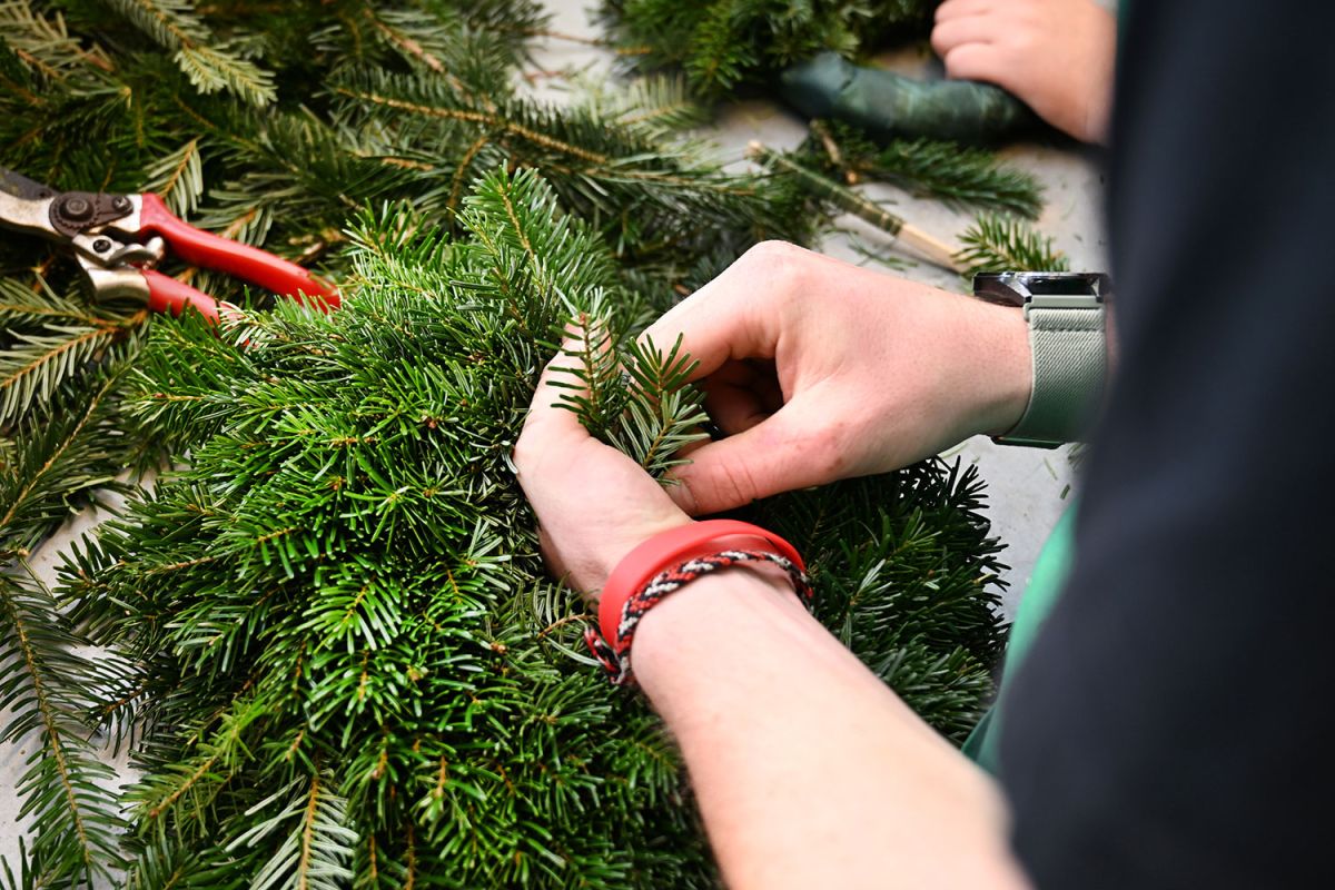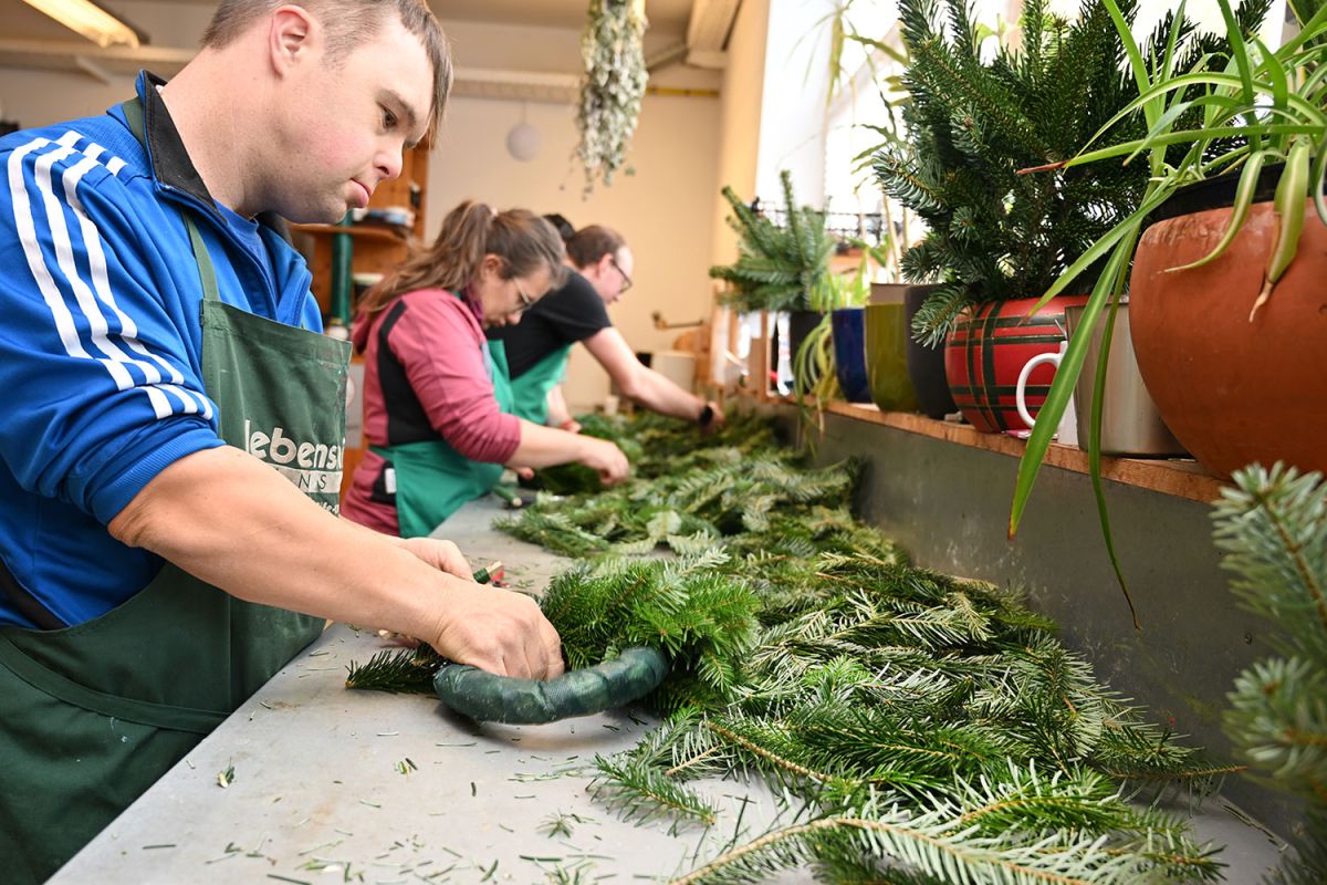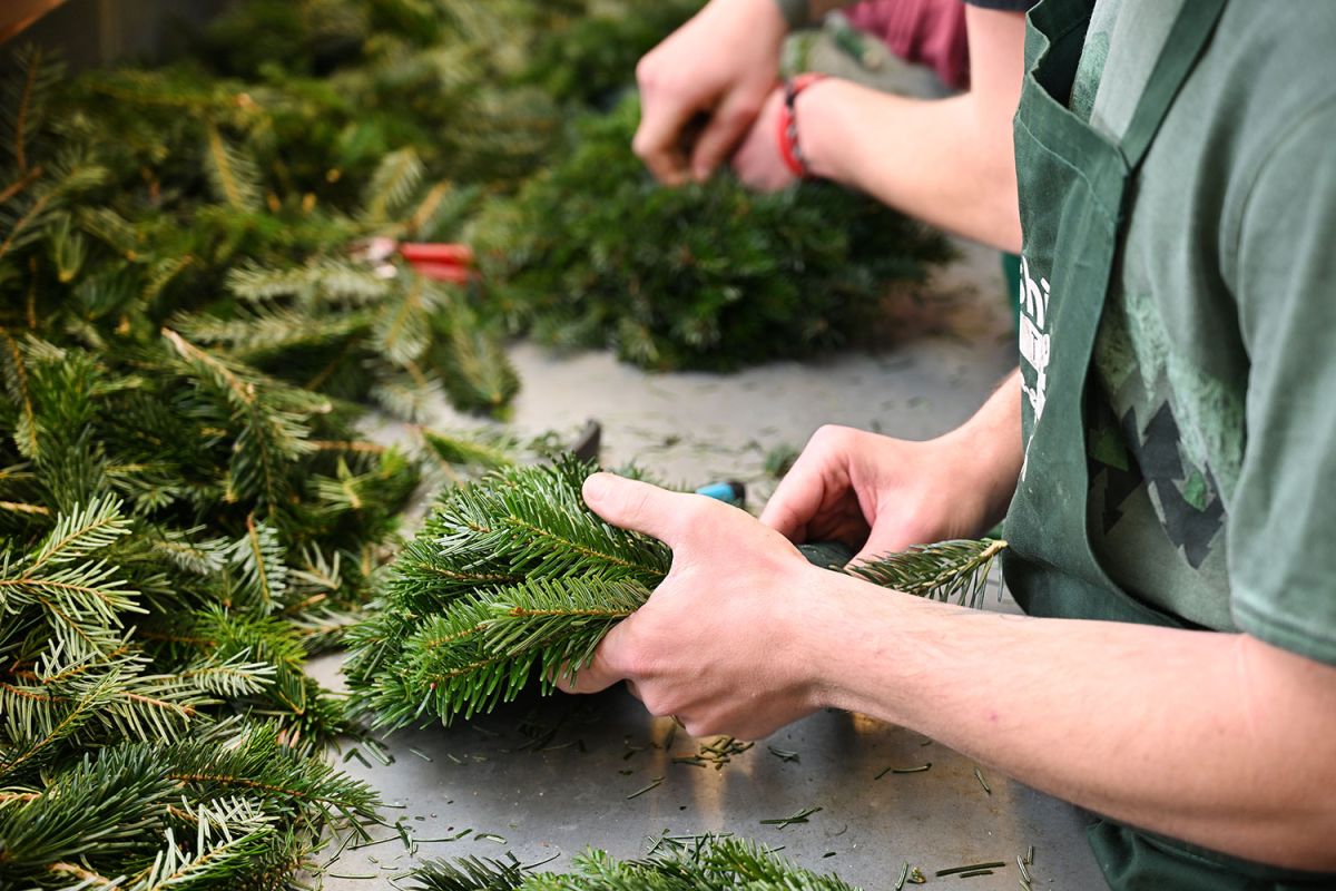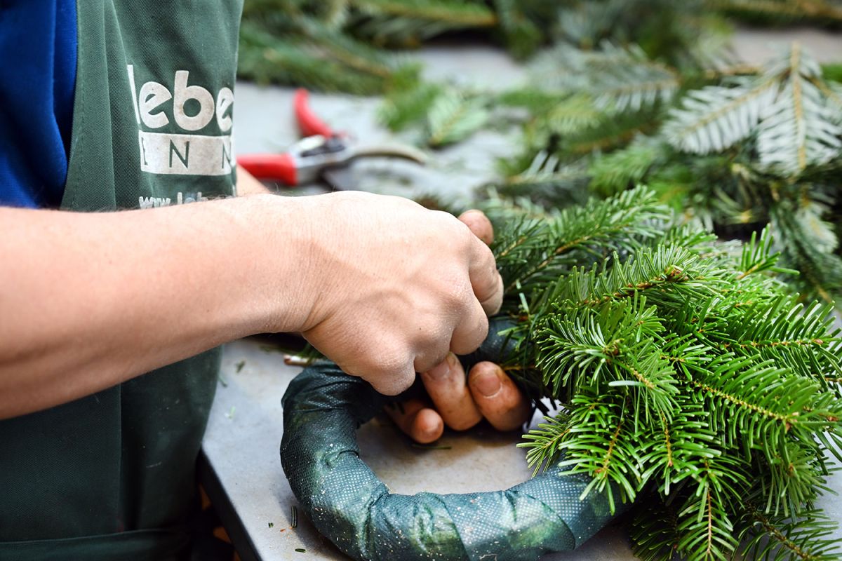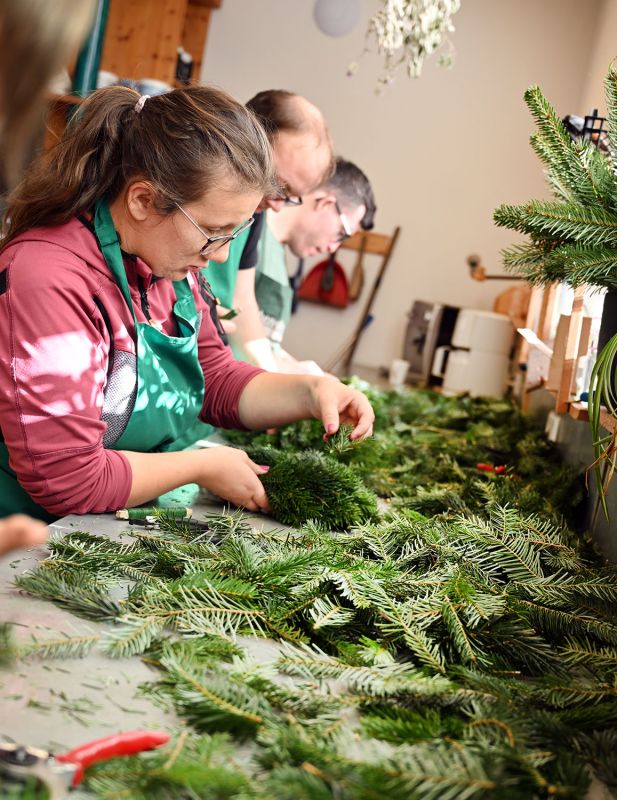 Dann werden Unmengen an Tannengrass, Bändern, Kerzen und Zapfen zu kunstvoll gebundenen Adventkränzen verarbeitet – ganz nach dem traditionellen Handwerk. Alle sind mit eingebunden. Und es ist erstaunlich, mit welcher Geschicklichkeit ein Kranz nach dem anderen entsteht – in verschiedensten Größen und Ausführungen oder in ganz invididueller Gestaltung nach Kundenwunsch.