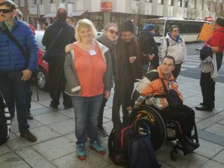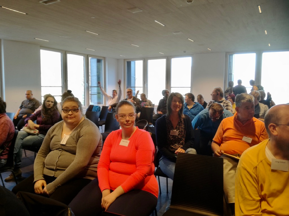 Am nächsten Tag trafen wir uns um 7:30 zum Frühstück, anschließend teilten wir uns in unsere Arbeitsgruppen auf. Karoline war als einzige von uns in der AG 2 gemeldet, eine Selbstvertreterin aus der Schweiz erklärte sich sofort bereit Karoline zu unterstützen. Karoline und Ramona verstanden sich sofort und so war Ramona in diesen Tagen sehr oft an der Seite von Karoline. Die AG dauerten den ganzen Tag, natürlich mit Pausen u. Mittagessen. Es wurde in allen Gruppen fleißig gearbeitet und diskutiert. Wir UnterstützerInnen beschäftigten uns mit den Fragen: Was können wir bei unserer Arbeit in der Unterstützung anders machen? Wie sehen wir Selbstvertretung in der Zukunft?