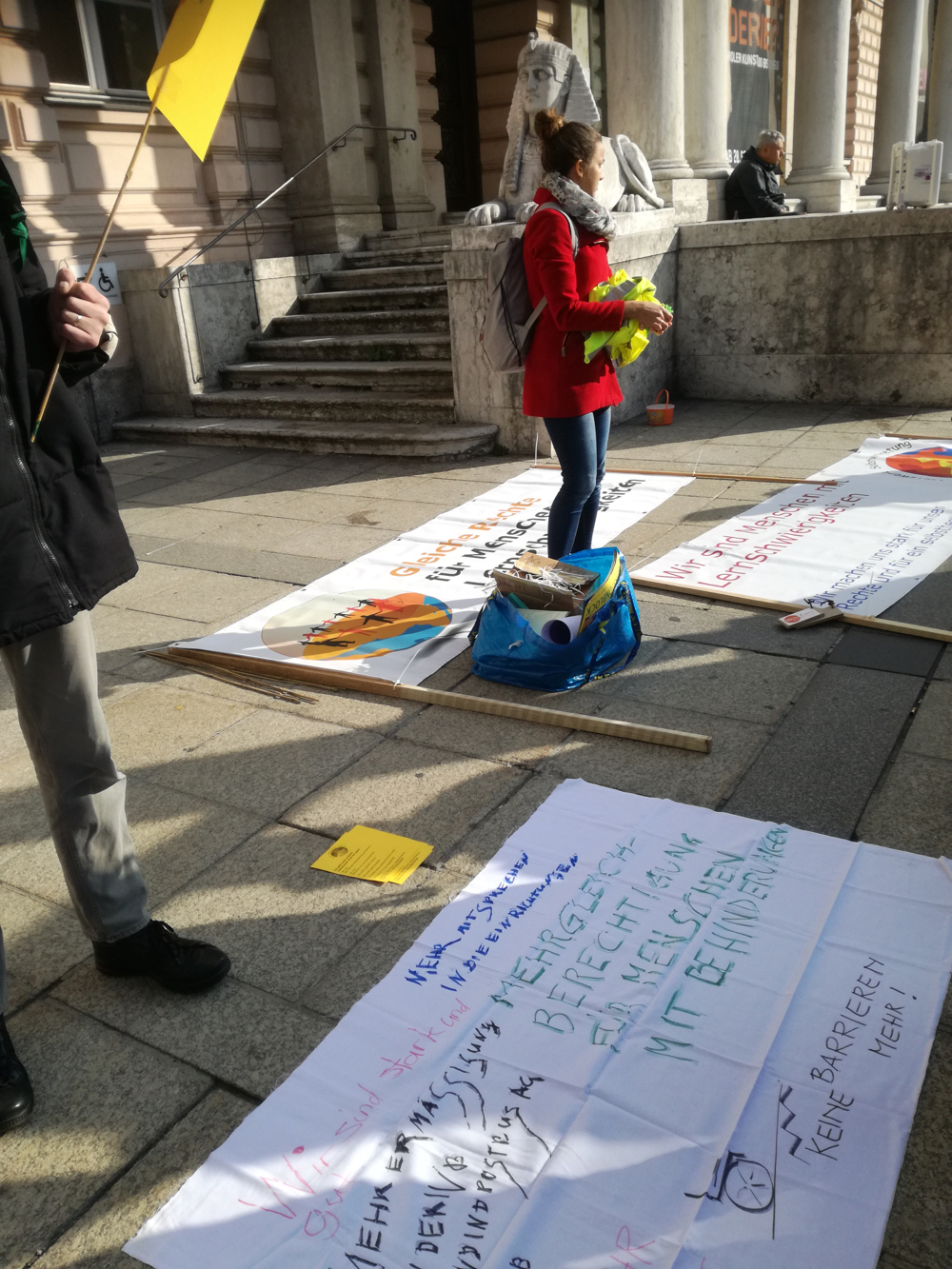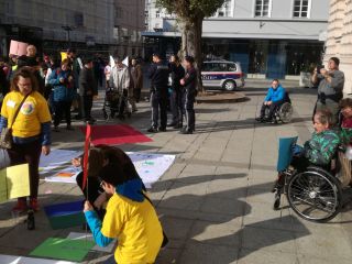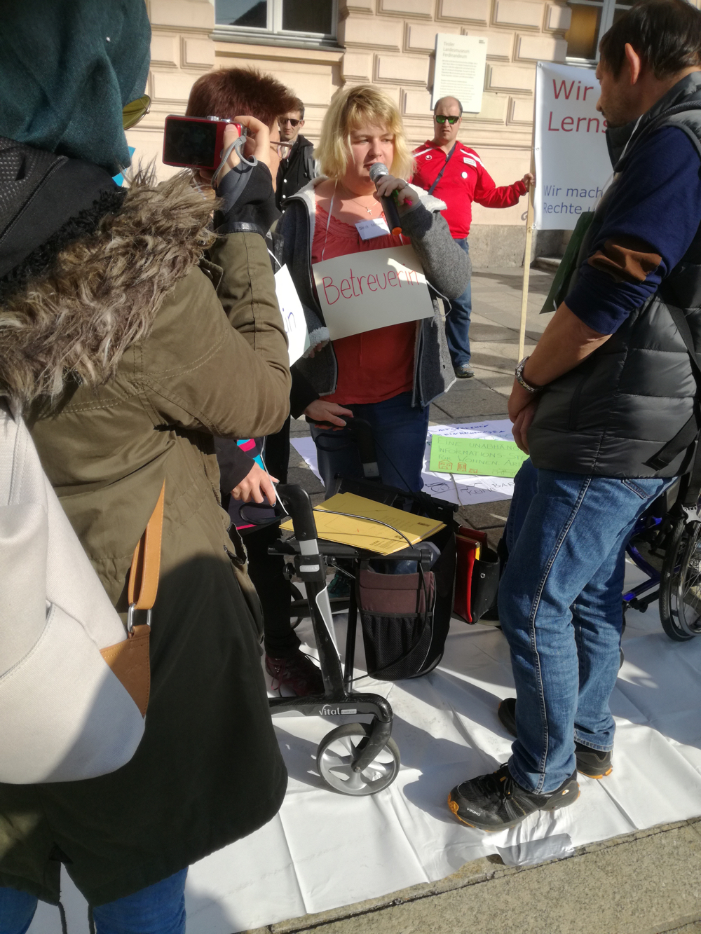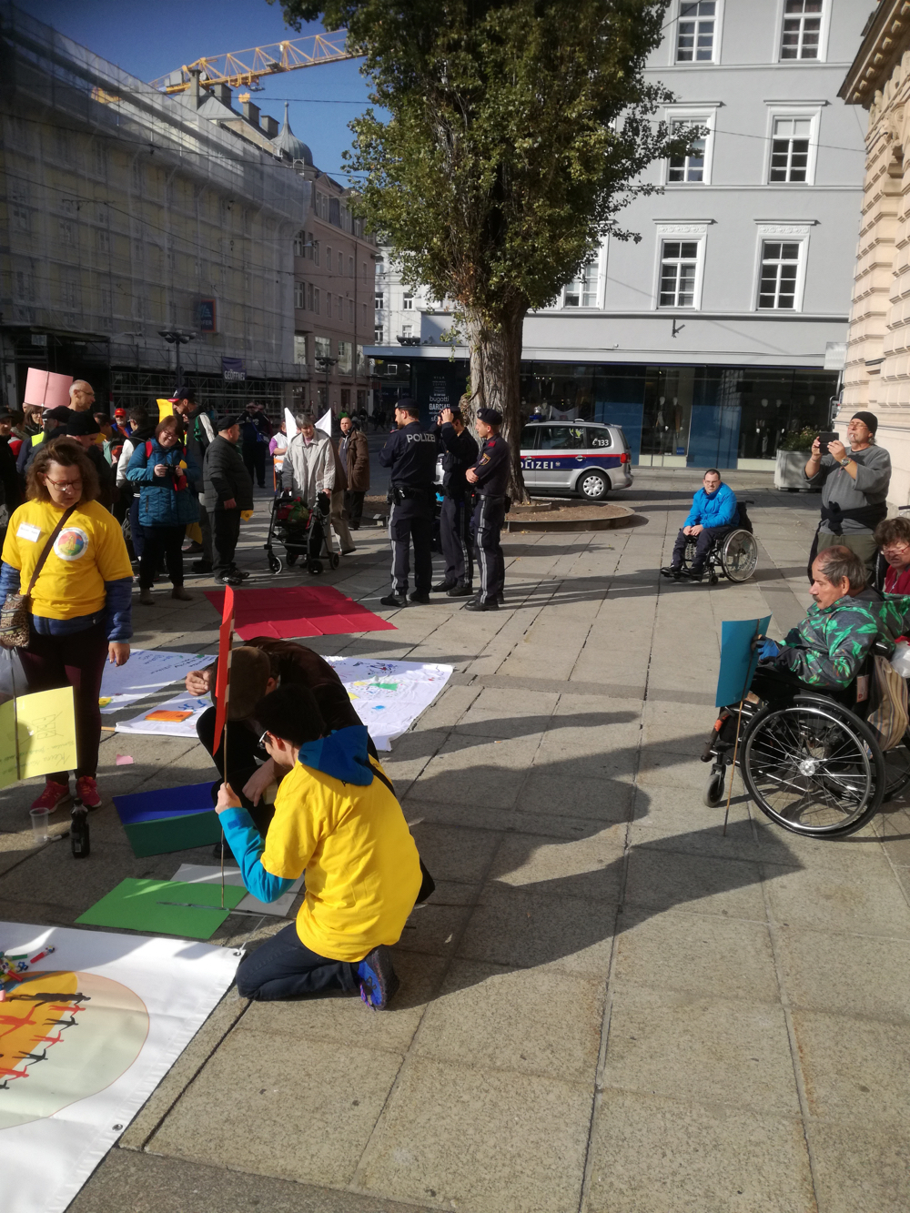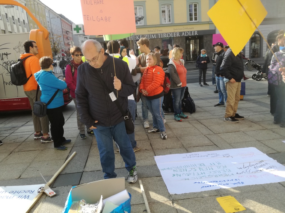 Um 9 Uhr fuhren wir mit einem Shuttle-Dienst zum Bahnhof. Danach ging es mit dem Zug nach Innsbruck. Von unserer LH 4-You Gruppe nahmen Melanie Strick, Roman Steinwender, Michael Baldinger, Christina Kroppe und Mathilde Pilz teil. Unser Treffpunkt war das Landes-Museum. Wir schrieben noch Plakate und bereiteten uns für die Demonstration vor. Es waren ca.100 Personen von uns dabei. Um 11 Uhr begann die Aktion mit dem Motto: Es geht auch anders. Mit Forderungen von Heidi und Oswald aus dem Megafon und dem Sprechchor von uns zogen wir durch die Innenstadt von Innsbruck, in Begleitung der Polizei. Es war ein sonniger Tag, viele Menschen waren auf den Straßen und tranken ihren Kaffee im Freien. Es wurden viele auf uns aufmerksam und einige schlossen sich uns an. Um 14 Uhr fuhren wir wieder mit dem Zug nach Matrei.