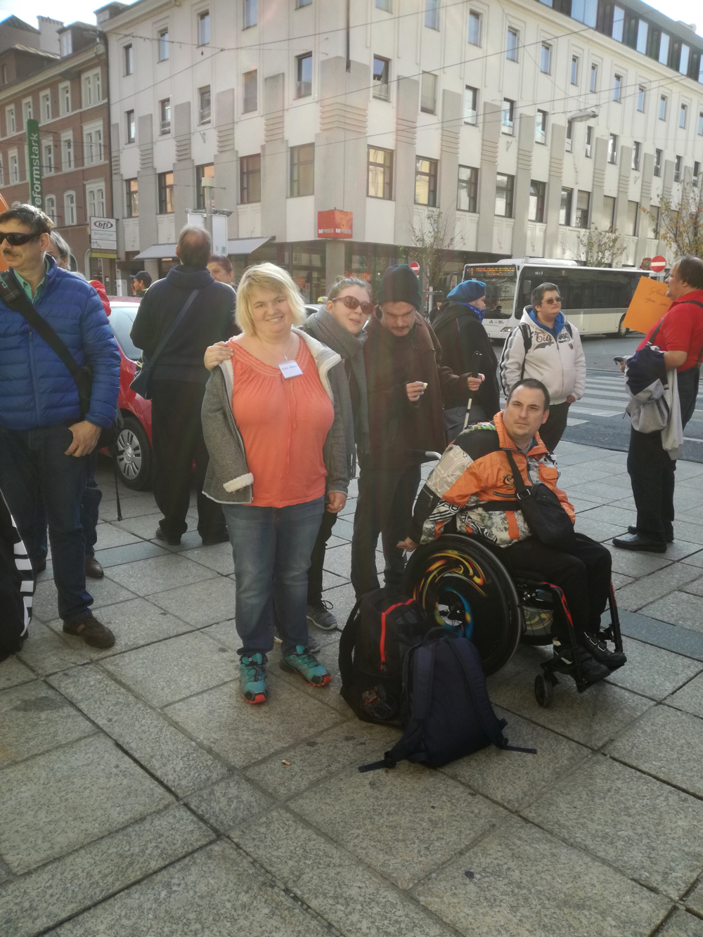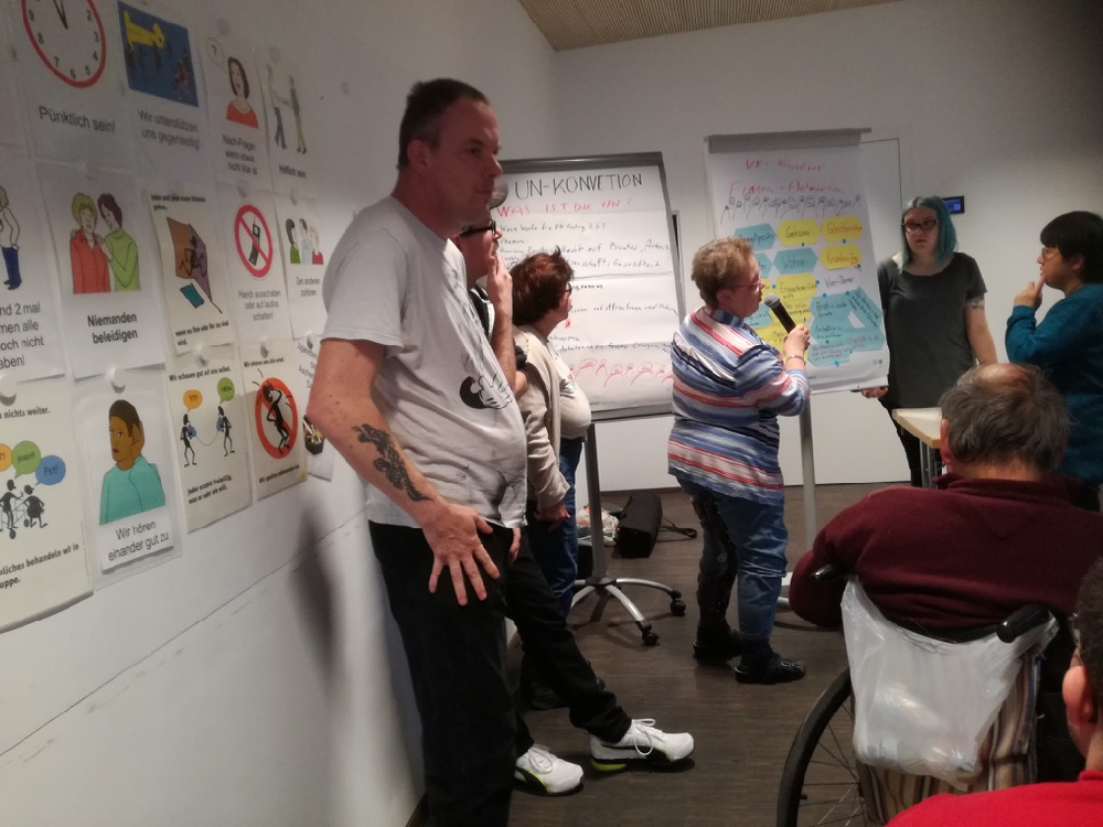 Wir teilten uns innerhalb unserer Gruppe in Kleingruppen auf. Verschiedene Sichtweisen zu den Themen und Erfahrungen aus der Arbeit, wurden erarbeitet und besprochen. Wir vereinbarten miteinander, uns alle zu vernetzen, um mehr Informationen zu bekommen und Ideen zu entwickeln. Die SelbstvertreterInnen in der AG 4 waren sich über den Ablauf der Aktion in Innsbruck uneinig u. es wurde in dieser Gruppe heftig diskutiert. Am späten Nachmittag präsentierten die AG ihre Ergebnisse. Nach dem Abendessen (20 Uhr) gab es noch einen Vortrag über die UN-Regeln. Auch einige von uns nahmen daran teil. Später besorgten wir uns noch die Zugkarten für die Fahrt nach Innsbruck.